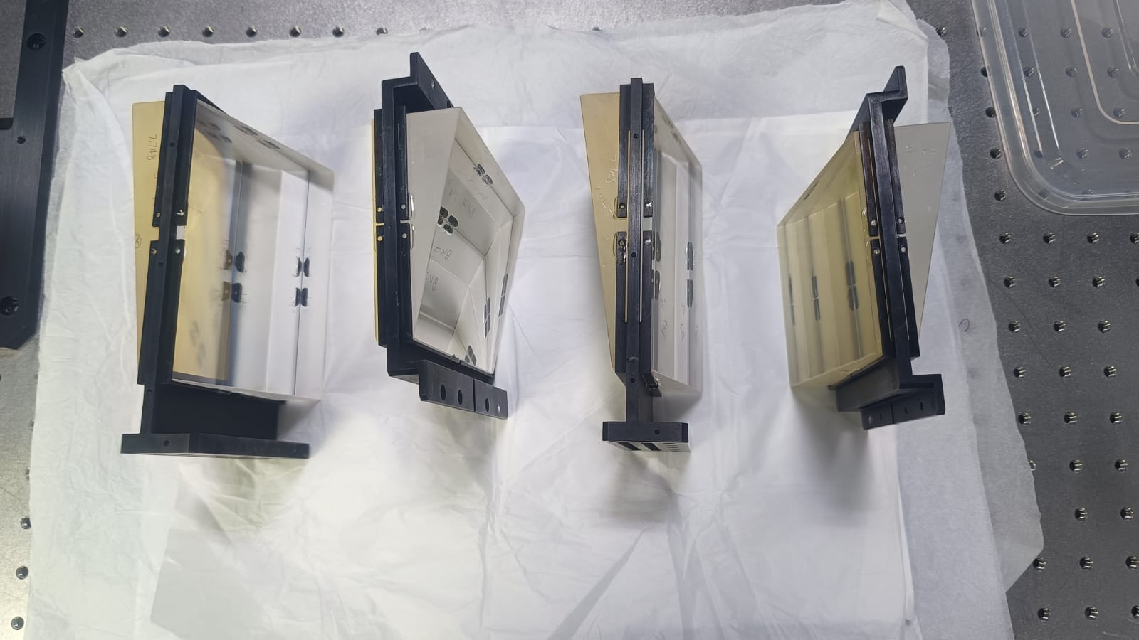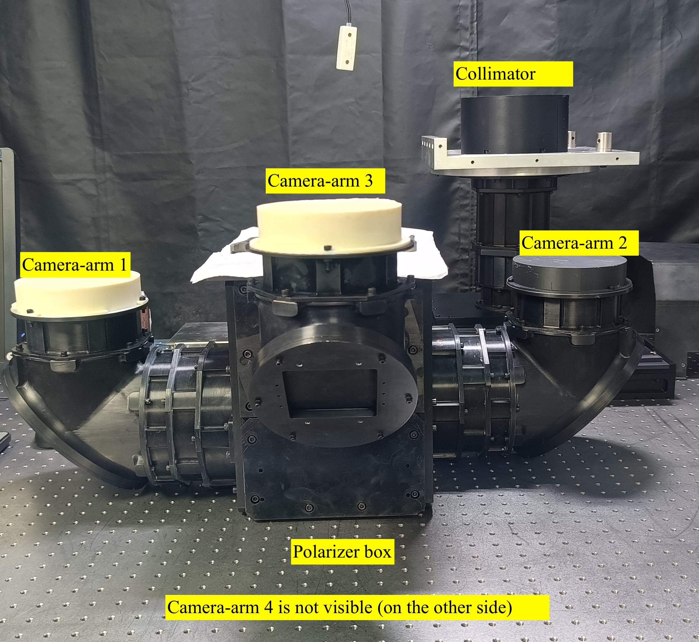 Optical bench tests of the collimator and cameras.  | | Polarizer assembly.  |